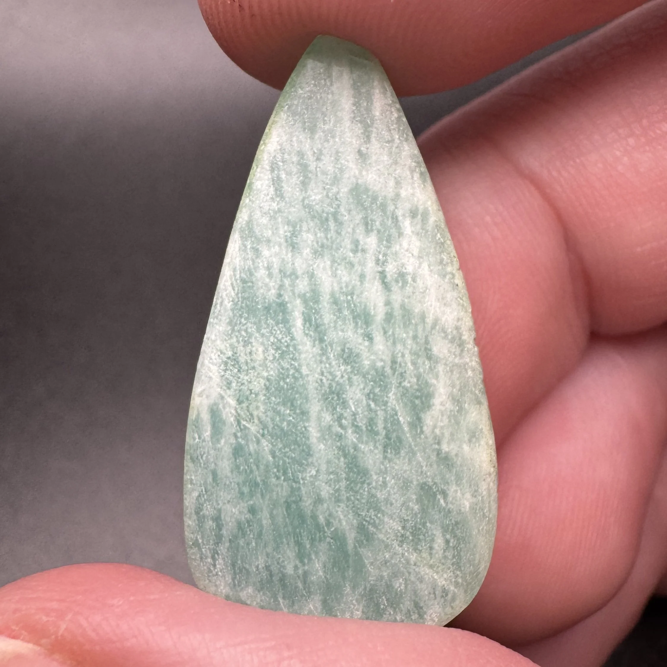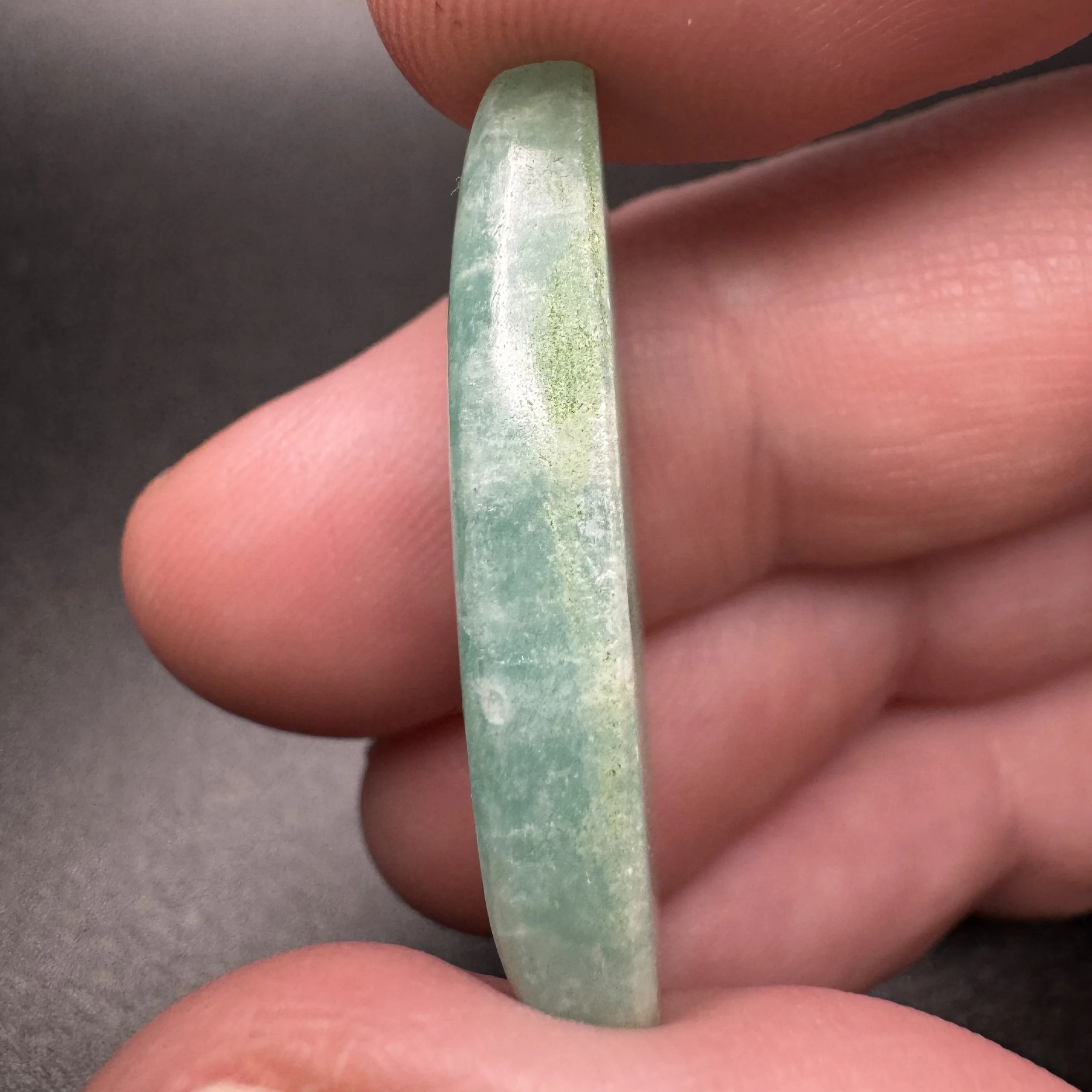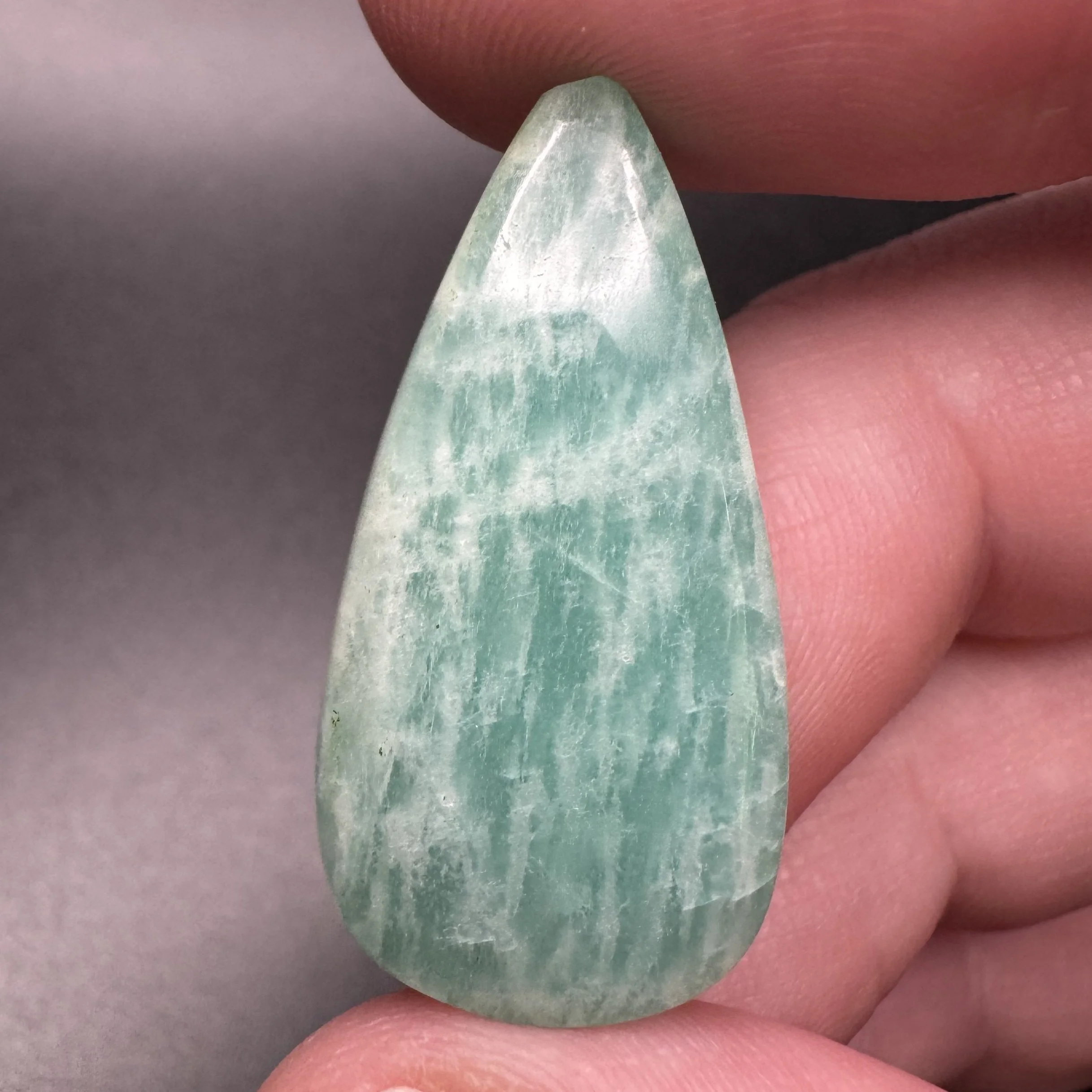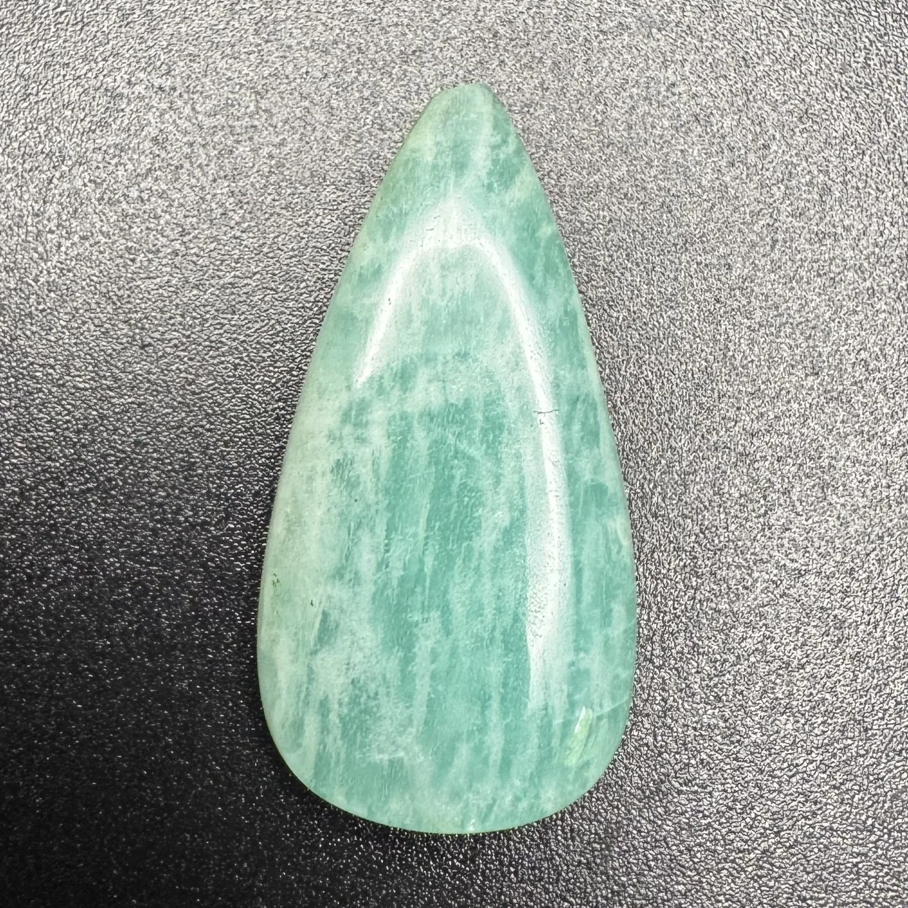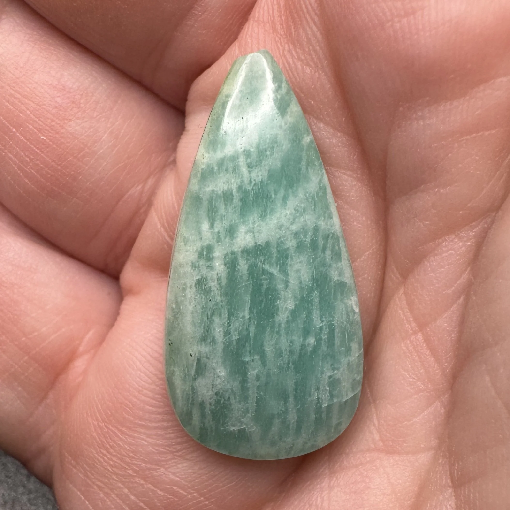 This beautiful amazonite cabochon weighs approximately 4.1g and measures 1.25”x0.5”x0.125” and is slightly chatoyant (shimmery). The tip has chipped off, which is reflected in the price. Cabochons are flat on one side and rounded and polished on the other. They are ideal for setting in jewelry but can also be used as worry stones or meditation aids.